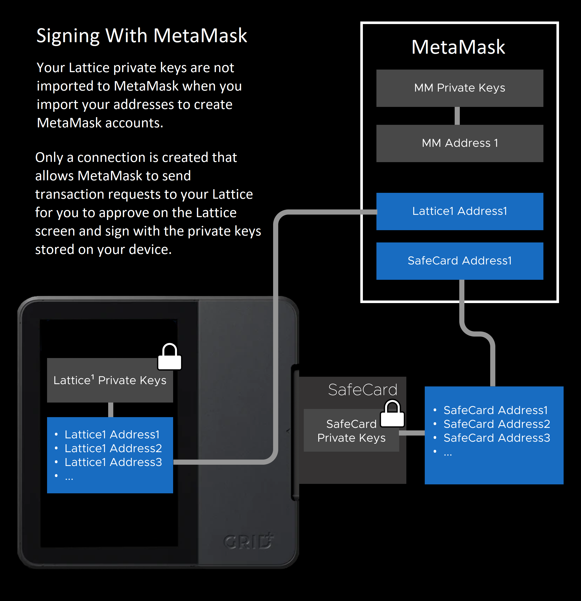 When you connect your Lattice to MetaMask, your private keys remain safely stored on the hardware wallet, which means signing transactions will require approval on both MetaMask and then the Lattice screen.
