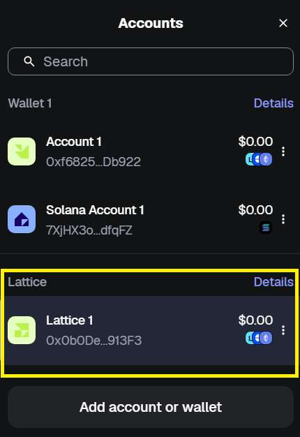 These accounts will be grouped under the Lattice group in the **list of accounts**, this means that they are separate from the MetaMask hot wallet. Like this: