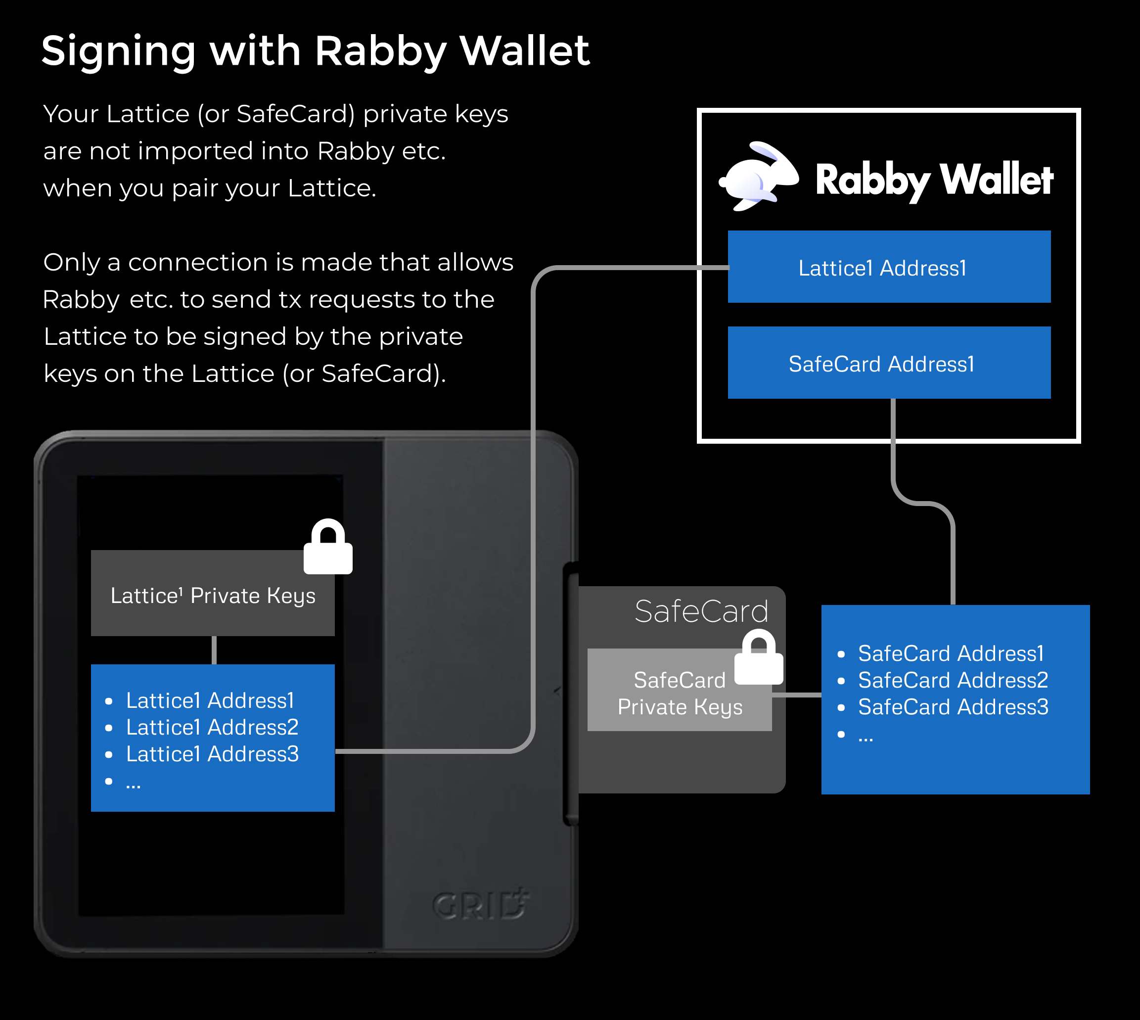 You will only import your **addresses (public keys)** and create a communication channel between Rabby and your device, your **private keys** remain stored on the Lattice.&#x20;